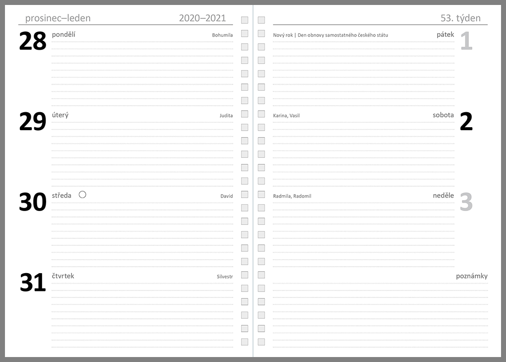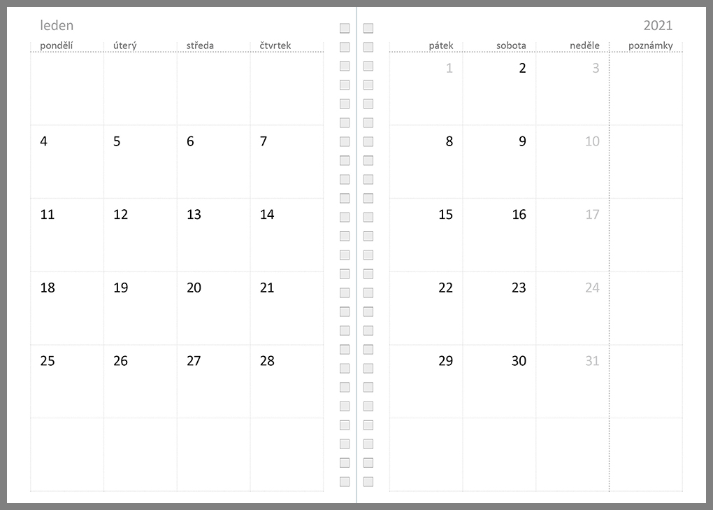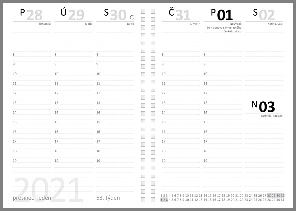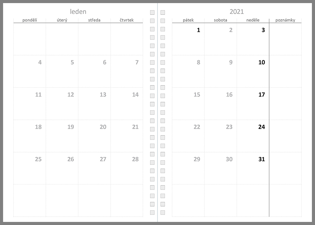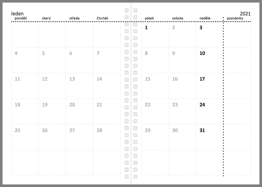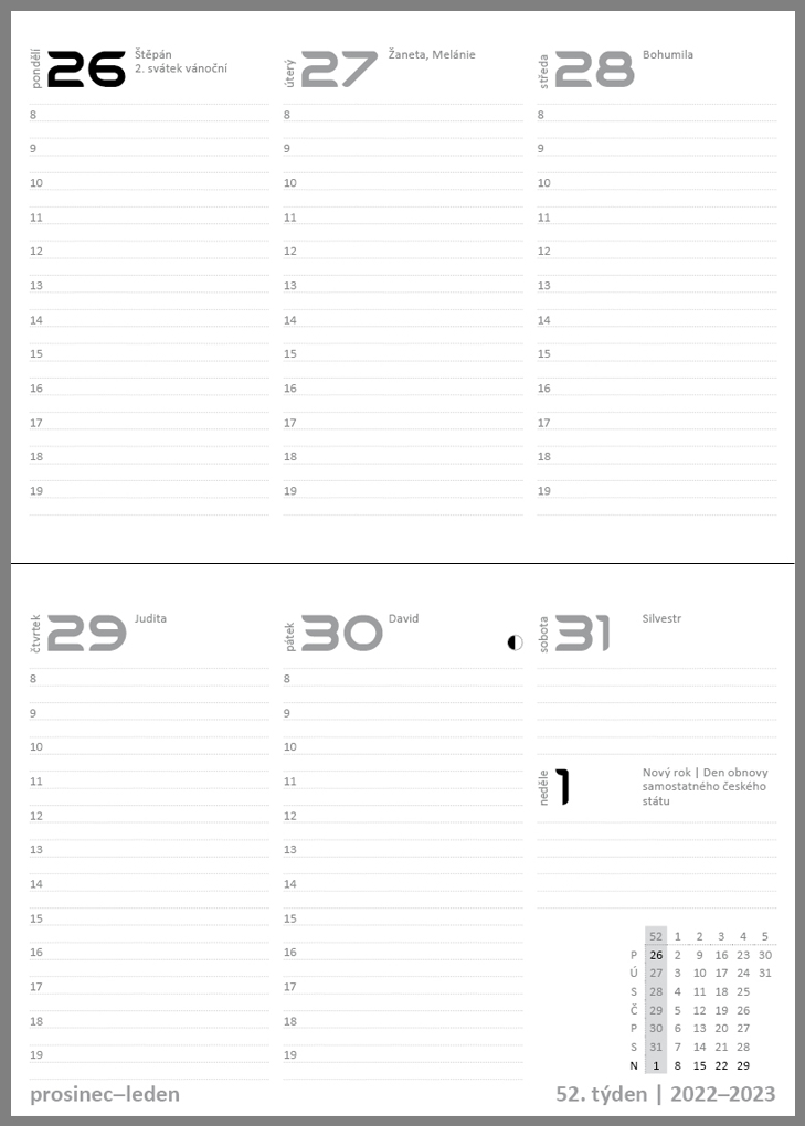 Ať už si zvolíte jakékoli období, které má váš diář pokrývat, vždy v kalendáriu najdete ještě o týden navíc před a týden navíc po.