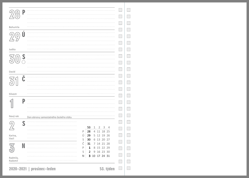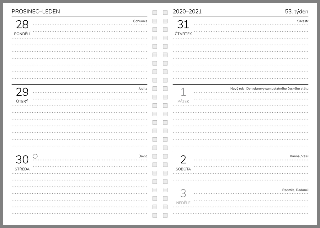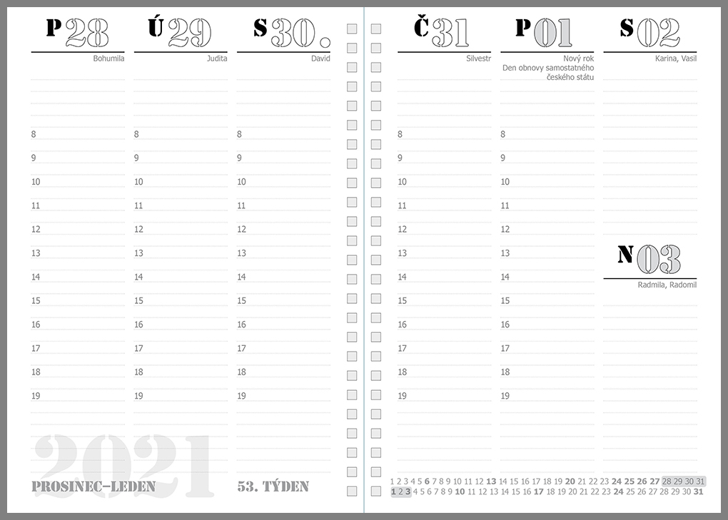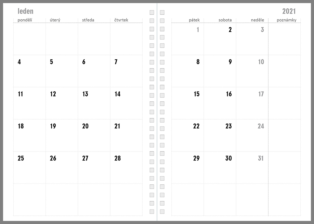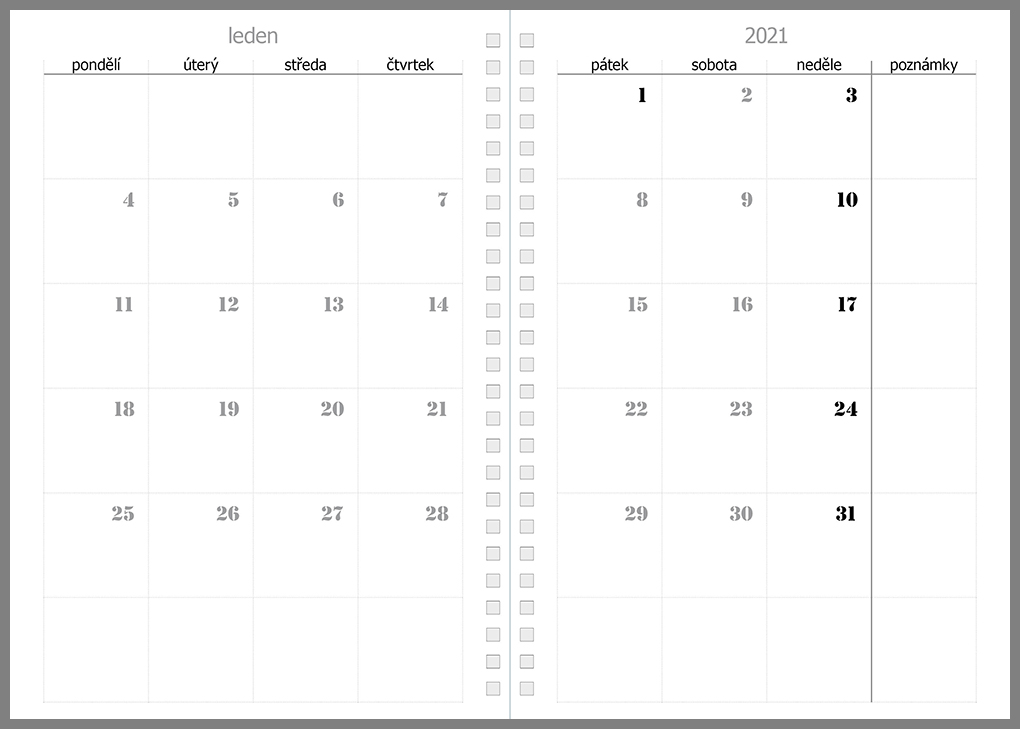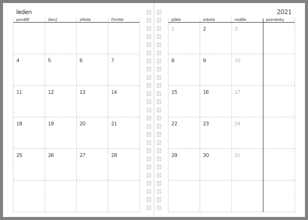 Ať už si zvolíte jakékoli období, které má váš diář pokrývat, vždy v kalendáriu najdete ještě o týden navíc před a týden navíc po.
