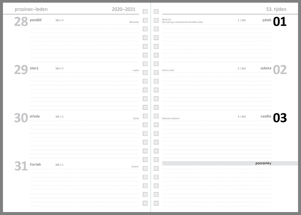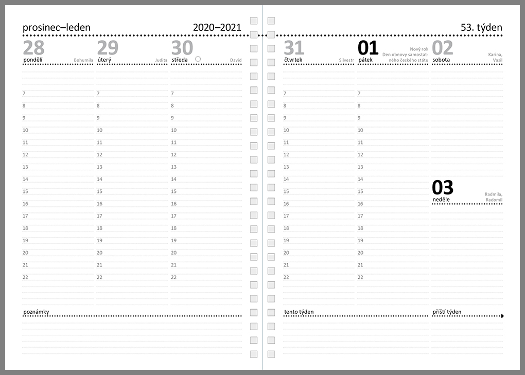 Pro výběr toho nejvhodnějšího kalendária podrobte průzkumu své poznámky. Raději si píšete různé seznamy s relativně krátkými poznámkami nebo úkoly? Pravděpodobně pro vás budou vhodnější kalendária orientovaná svisle, do sloupců. Pokud máte nepravidělně vytížené dny v týdnu, možná pro vás bude ideální diář Hedvika, kde je volná strana pro poznámky plynule navazující na týdenní řádkové rozložení jednotlivých dnů - máte tedy zároveň přehled i spoustu prostoru. Pro žáky a studenty budou užitečná sloupcová kalendária s předepsanými hodinami, která už stačí doplnit jen o předmět a poznámku například o úkolu nebo zkoušce.