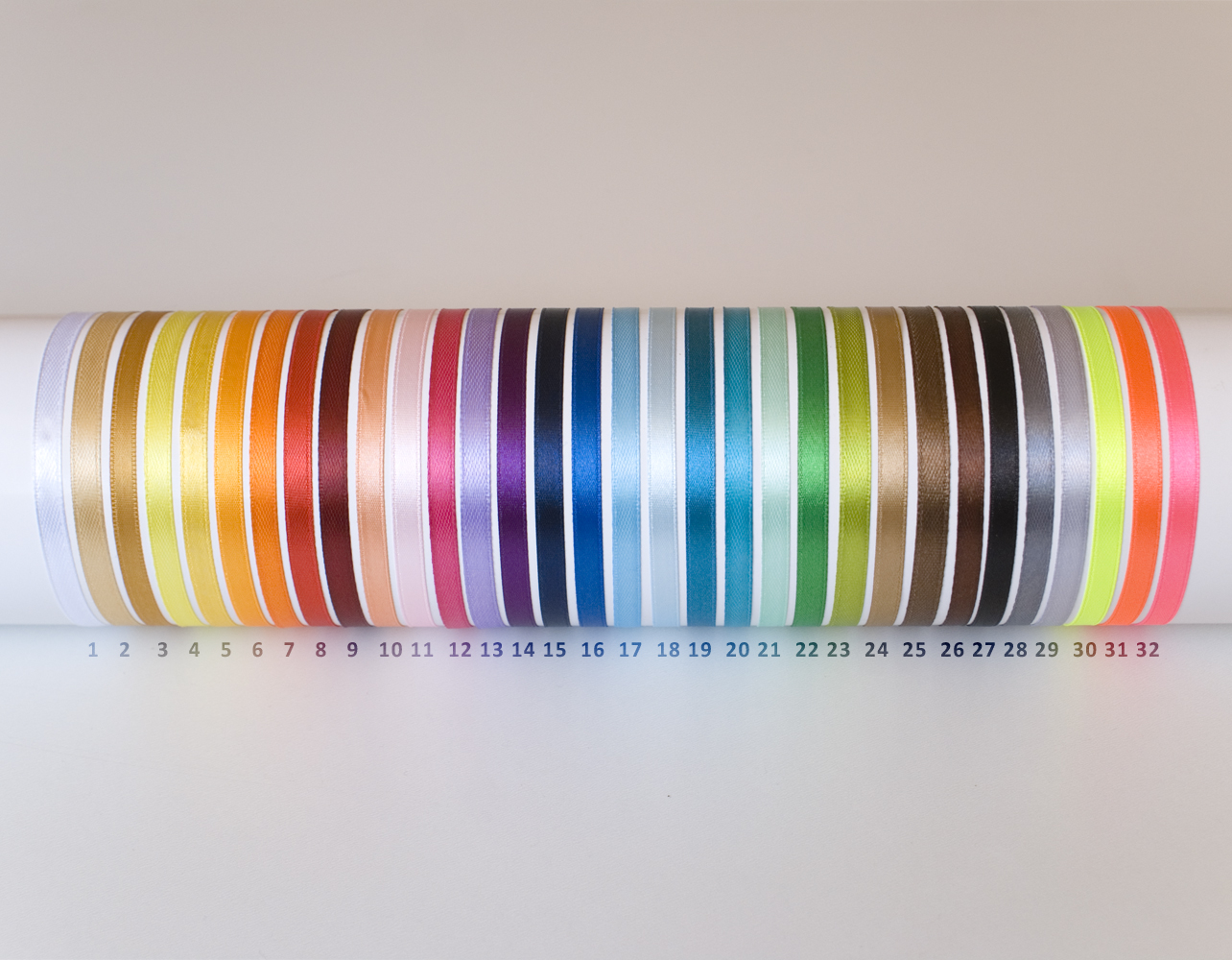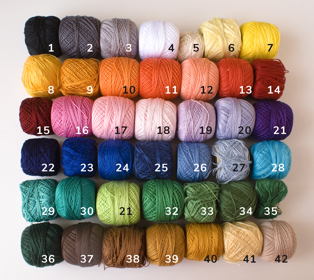 Dostupné barvy šitých kapitálků: černá (1), tmavě šedá (2), světle šedá (3), bílá (4), krémová (5), světle žlutá (6), žlutá (7), teplá žlutá (8), žlutooranžová (9), oranžová (10), tmavá oranžová (11), lososová (12), červená (13), vínová (14), tmavá vínová (15), sytá růžová (16), růžová (17), světlounká růžová (18), světle fialová (19), lila (20), fialová (21), modrofialová (22), tmavě modrá (23), královská modrá (24), tlumená modrá (25), středně modrá (26), světle modrá (27), tyrkysová (28), světlá mentolová (29), mentolová (30), zelenožlutá (31), studená zelená (32), světle zelená (33), zelená (34), zelená (35), tmavá zelená (36), hnědá (37), teplá hnědá (38), písková (39), zlatavá (40), béžová (41), světlounce hnědá (42)