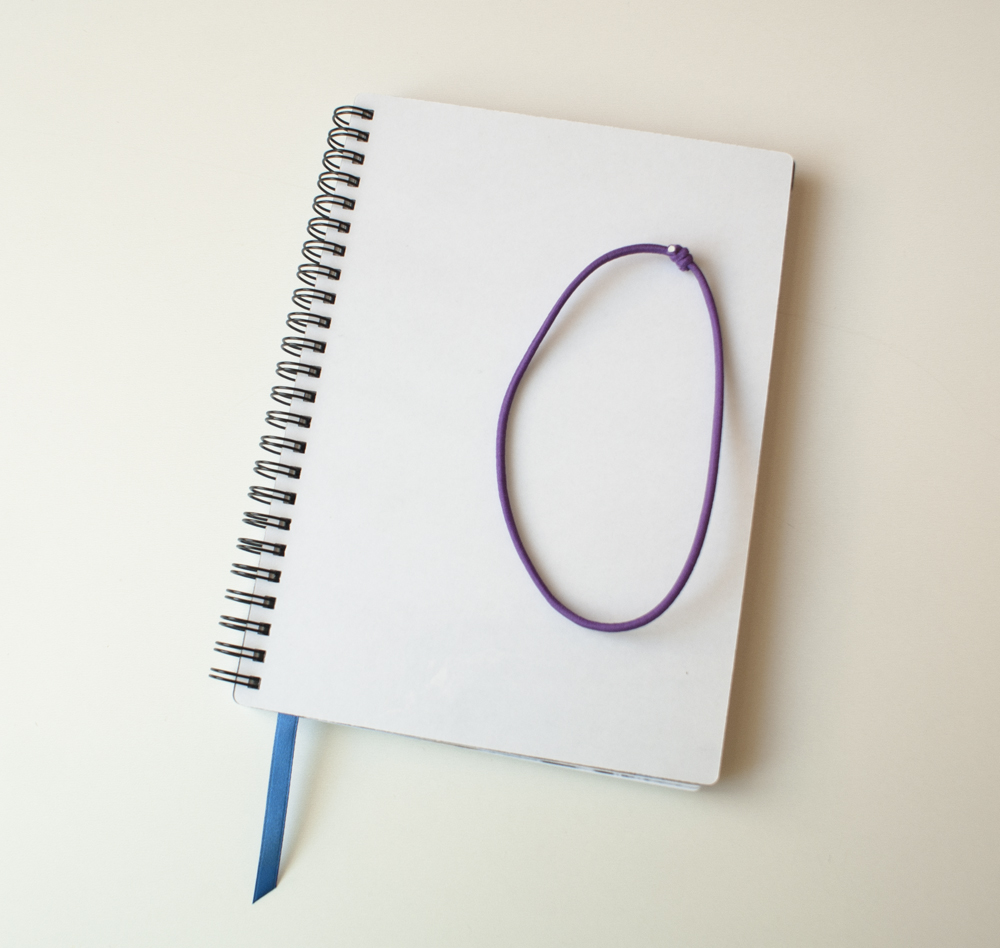Poutko na tužku nebo hladkou propisku vyrábím z 6mm ploché gumy. Velikost volím tak, aby se v poutku udržela i obyčejná tužka. Volné konce gumy jsou zašity a poutko je skryto v zadní desce, začištěno předsádkou - nedělá tedy vzadu žádné vyboulení a dobře se na něm píše.